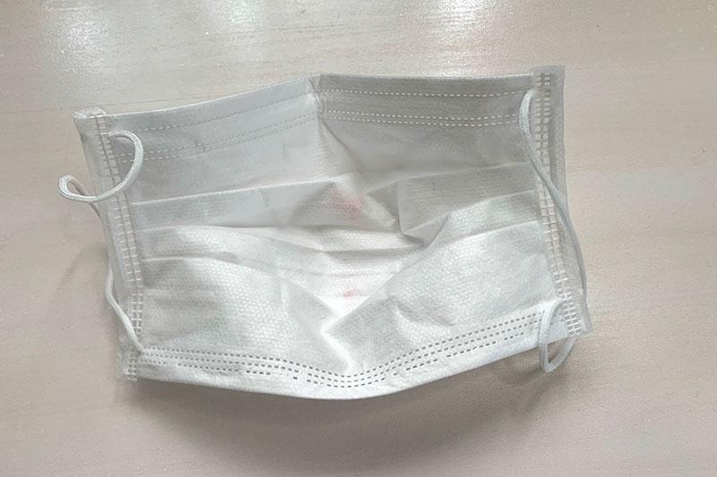 「マスクにメイクがつきにくい」と謳った、コンビニで買える「メイク仕上げローション」を顔に吹きかけ、ティッシュオフをすることなくマスクをつけてみました。「マスクにメイクがつきにくい」とパッケージに書いてあるものの、リップはつくだろうな…と思いつつ試しましたが、想像通りの結果に。しっかりマスクにリップがついています。