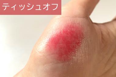 発色の良い、ツヤ系リップです。ティッシュオフすると輪郭がくずれて、色がぼやけてしまうのが残念。マスクへの色移りはほぼありませんが、ティッシュオフした時点でかなり色落ちしているので評価は低めです。