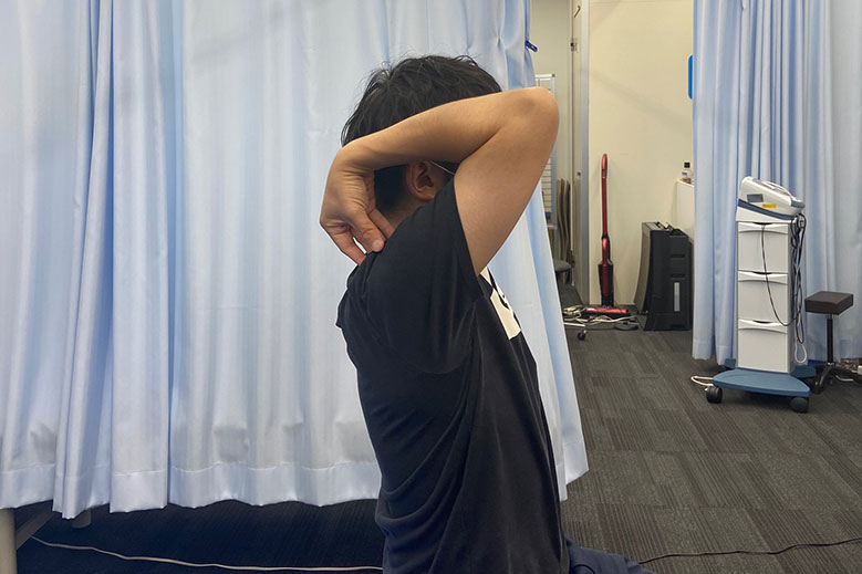②そのままゆっくりと肘を上げて、後方に回していきます。