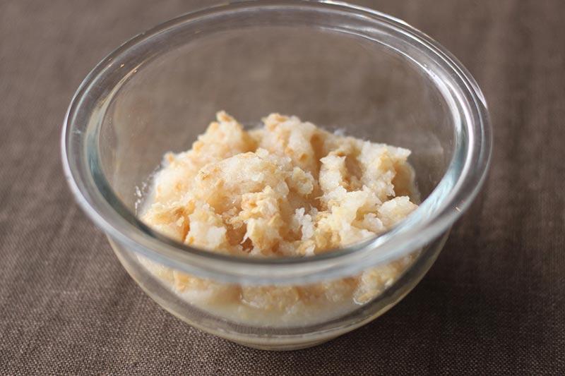 これでだいたい1カップ分くらいの切り干しおろしができあがります。大根をおろすと水がでますが、ここにも水分代謝を促進するカリウムが多く含まれるので、できれば捨てずに使います。最初は「ちょっと水っぽいな」と思うかもしれませんが、切り干しが水分を吸ってくれますし、栄養をまるごと全部摂ることができるのでおすすめです。