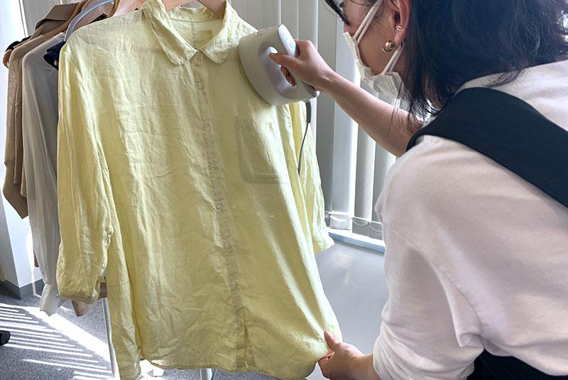 遠藤 綿や麻の洋服でしたら、洋服をひっぱりながらスチームをかけるとシワが取れやすくなります。表側にだけスチームをあててもシワが伸びにくい素材もありますので、うまくシワが取れないときは裏側からもスチーマーをあててみてください。